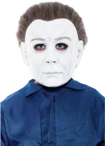 - Includes a Michael Myers mask with a full white face, eye holes, and attached brown hair.